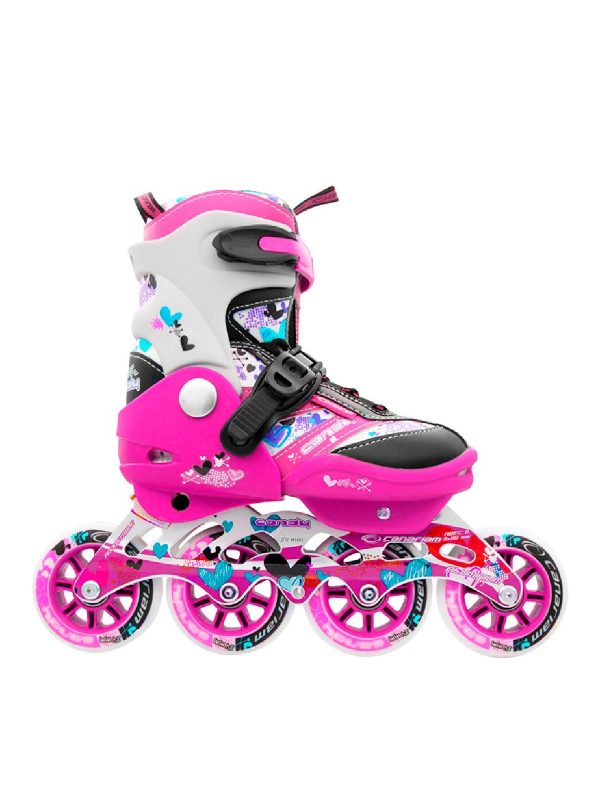 CARACTERÍSTICAS: Es un patín recreativo en línea ajustable por tallas. Rodamientos ABEC 7 u 11, ruedas en poliuretano de alta calidad, bujes en acero, centros y adaptadores en aluminio, doble recibidor y correas en PVC, cordones y chasis en aluminio.